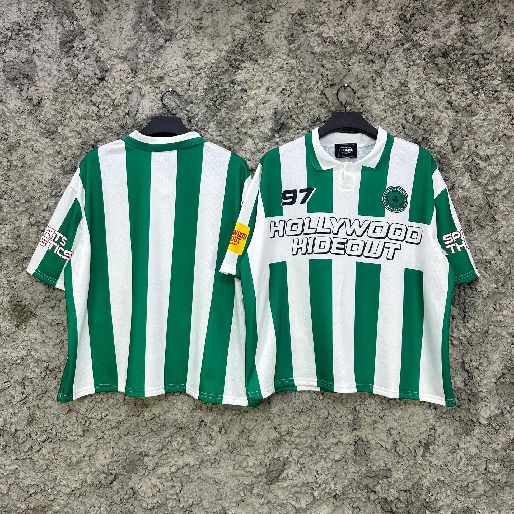 Channeling vintage football vibes with a bold streetwear twist, the Hollywood Hideout Retro Jersey is made for those who live at the intersection of sport and style. Featuring broad green and white stripes, collegiate-style logos, and striking sleeve graphics, this shirt pays homage to classic kits while keeping it contemporary.