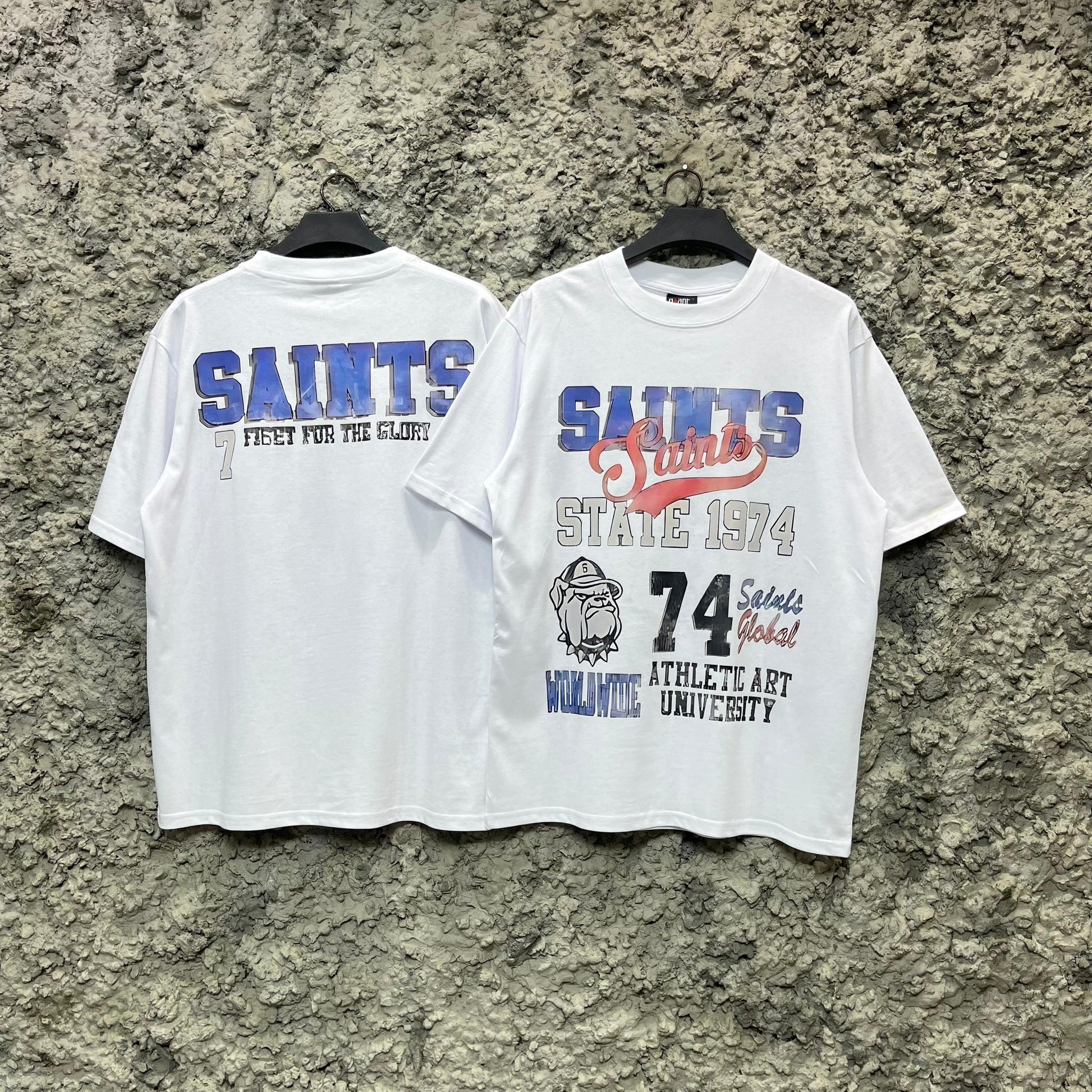 - Bold “SAINTS” lettering layered with a cursive overlay